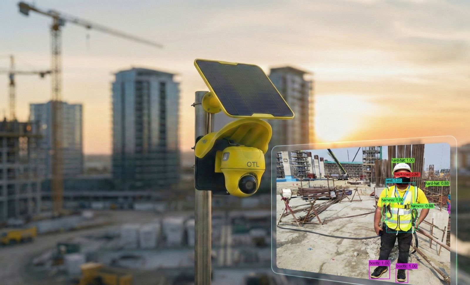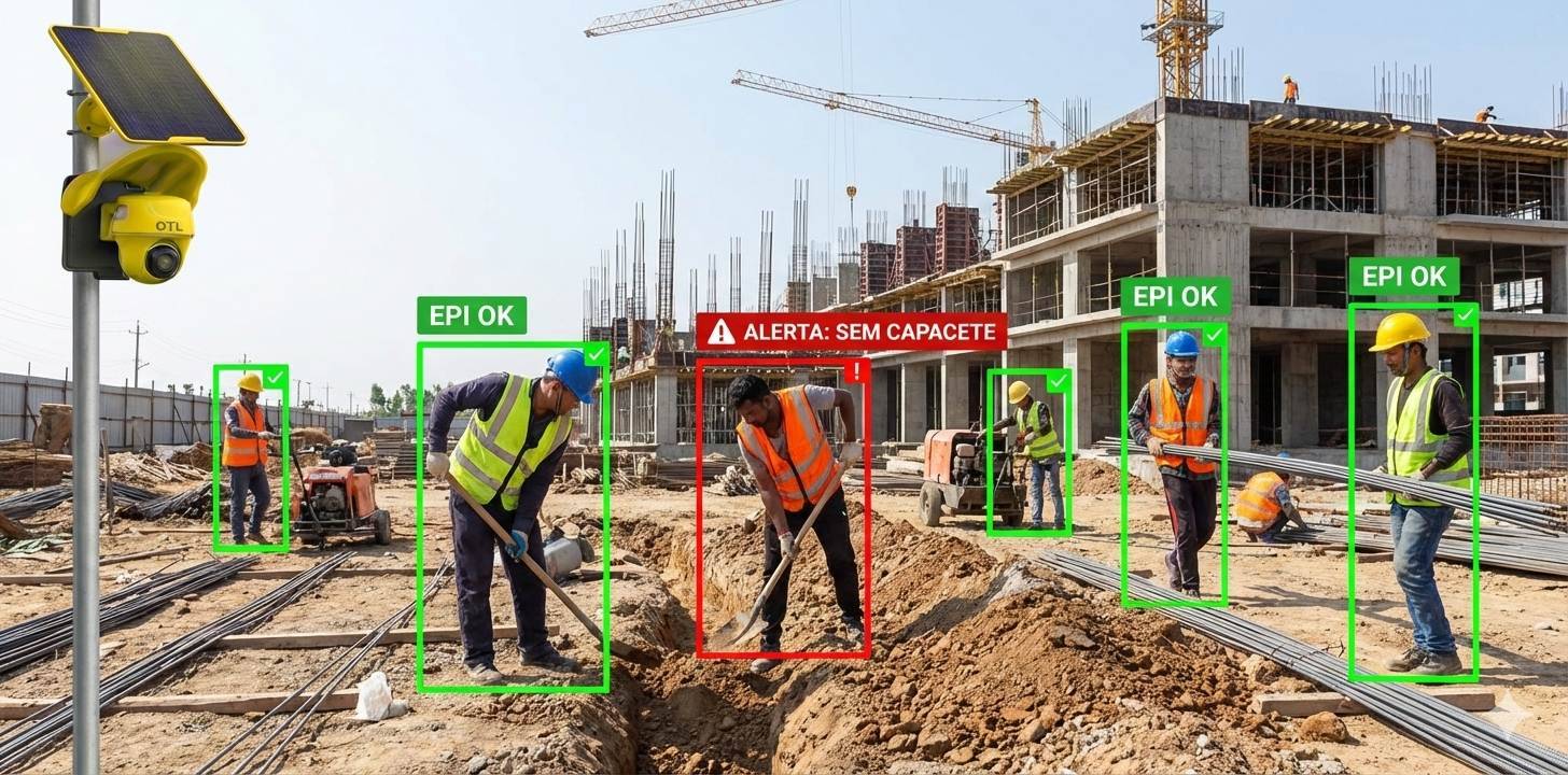 Análise por IA: o sistema identifica presença/ausência de EPIs por pessoa e por área.